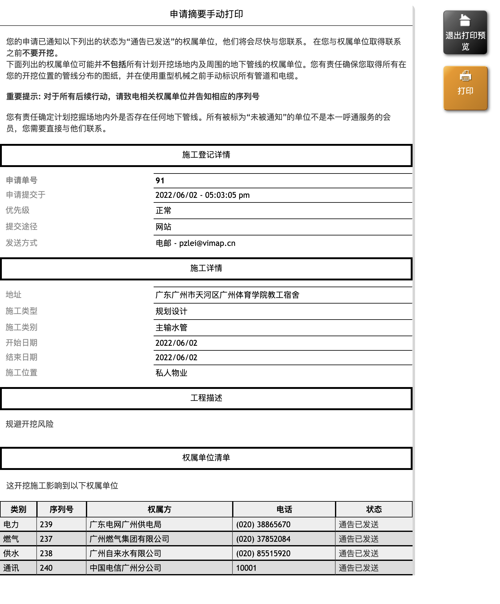 施工方首先提供项目基本信息,再告知大概的开挖作业地点,可以是简单的市区街道地址,或是更多的农村地区的GPS坐标,至少要提供足够的细节,以保证可以在地图上找到该区域。通知中心使用的基础地图越详尽处理的过程就越精准。